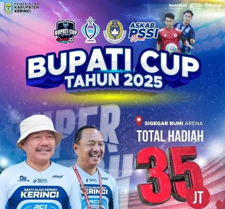 Flyer Bupati Kerinci Cup 2025. KERINCI, Cuitan.id – Setelah sempat vakum selama beberapa tahun, atmosfer sepakbola di Kabupaten Kerinci akhirnya kembali menggeliat. Asosiasi Kabupaten (Askab) PSSI Kerinci di bawah kepemimpinan Alfikri memastikan akan menggelar Turnamen Sepakbola Bupati Cup Kerinci 2025. Ajang bergengsi yang selalu di nantikan para pencinta si kulit bundar di daerah tersebut.
