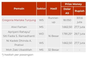 JAKARTA, Cuitan.id – Penampilan impresif Gregoria Mariska Tunjung di ajang Kumamoto Masters 2025 berbuah manis. Meski harus puas sebagai runner-up, tunggal putri andalan Indonesia itu berhasil membawa pulang hadiah uang terbesar dibanding seluruh wakil Merah Putih di turnamen tersebut.